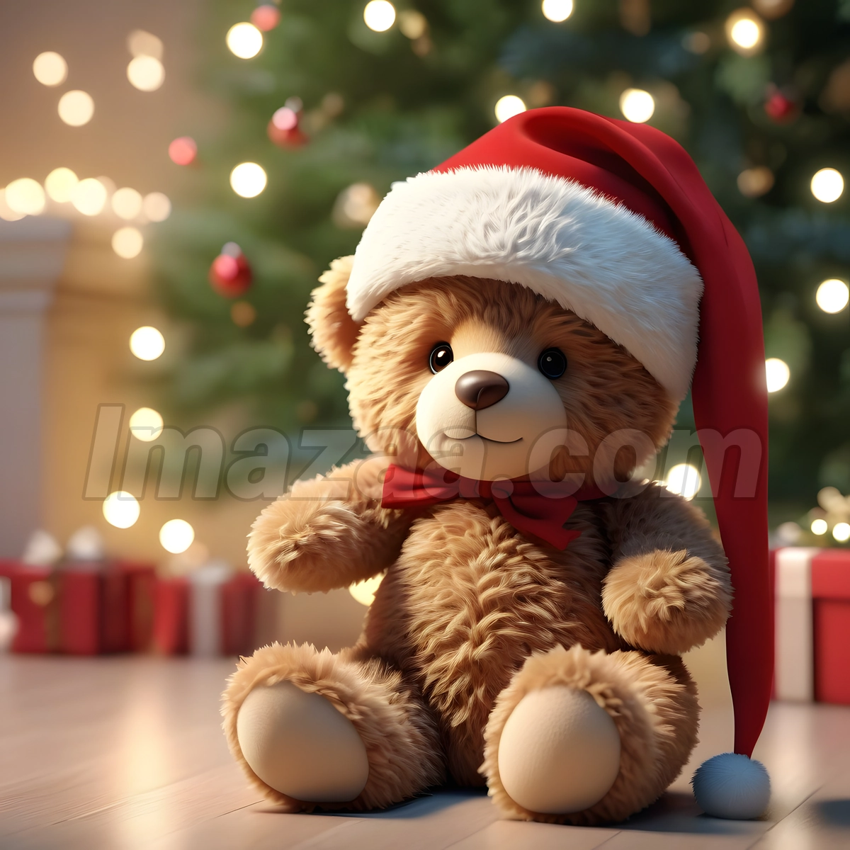 A teddy bear in a Santa hat sitting by a Christmas tree.